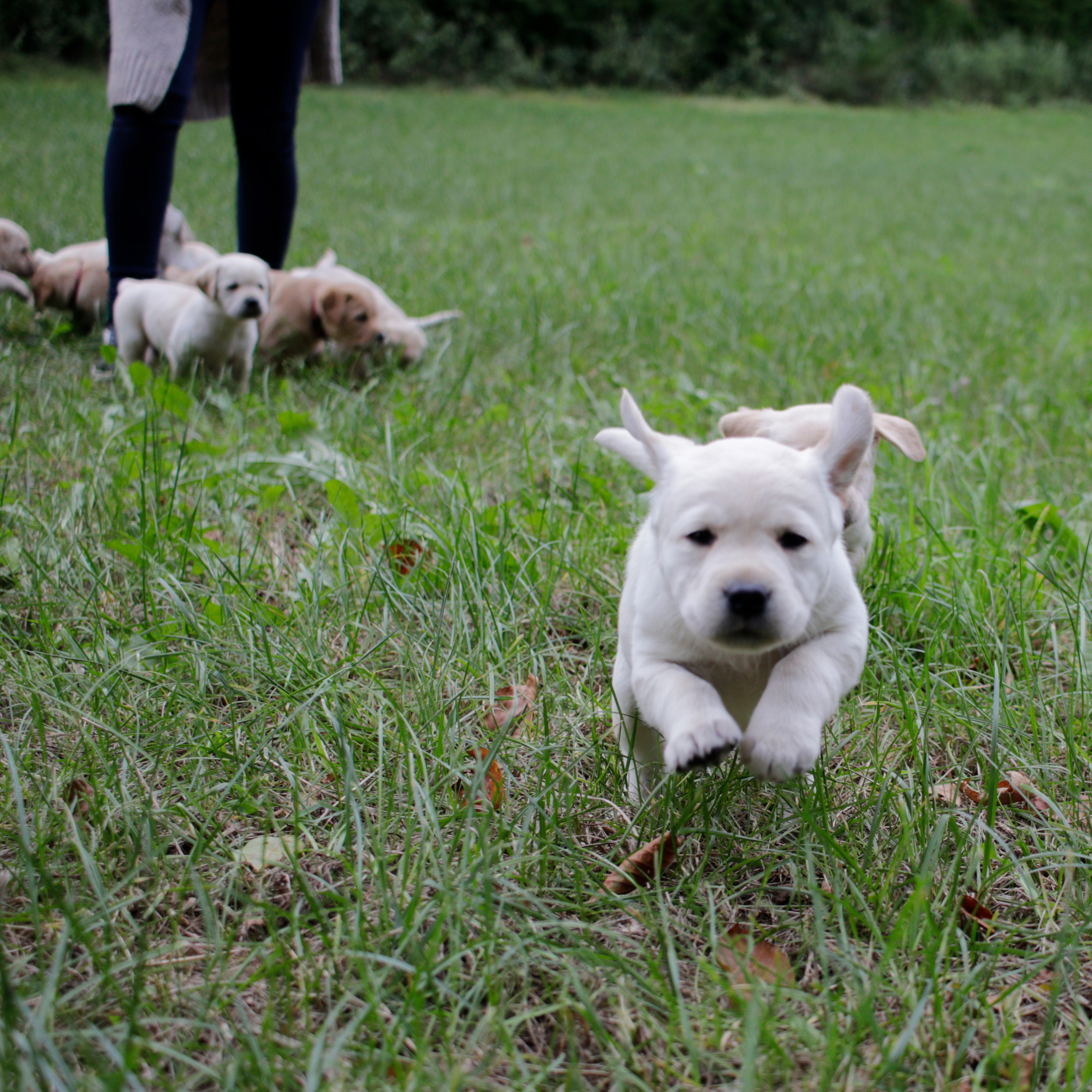 Labradore lieben Wasser und ein Bad im benachbarten See ist natürlich ein Muss für die kleinen Wasserratten. Einen weiteren Grundstein für das spätere Heranrufen ihres Welpen ist ein Pfiff, den wir jedes mal anwenden, wenn die Fütterung erfolgt. So verbindet der Welpe das Herankommen mit etwas sehr Angenehmem und wird dem immer gerne und verlässlich folgen. Für diese schöne Idee danke ich Nicole Weissmann, sie hat den Pfiff bei unserer Cherokee konditioniert, und ich führe das sehr gerne weiter.